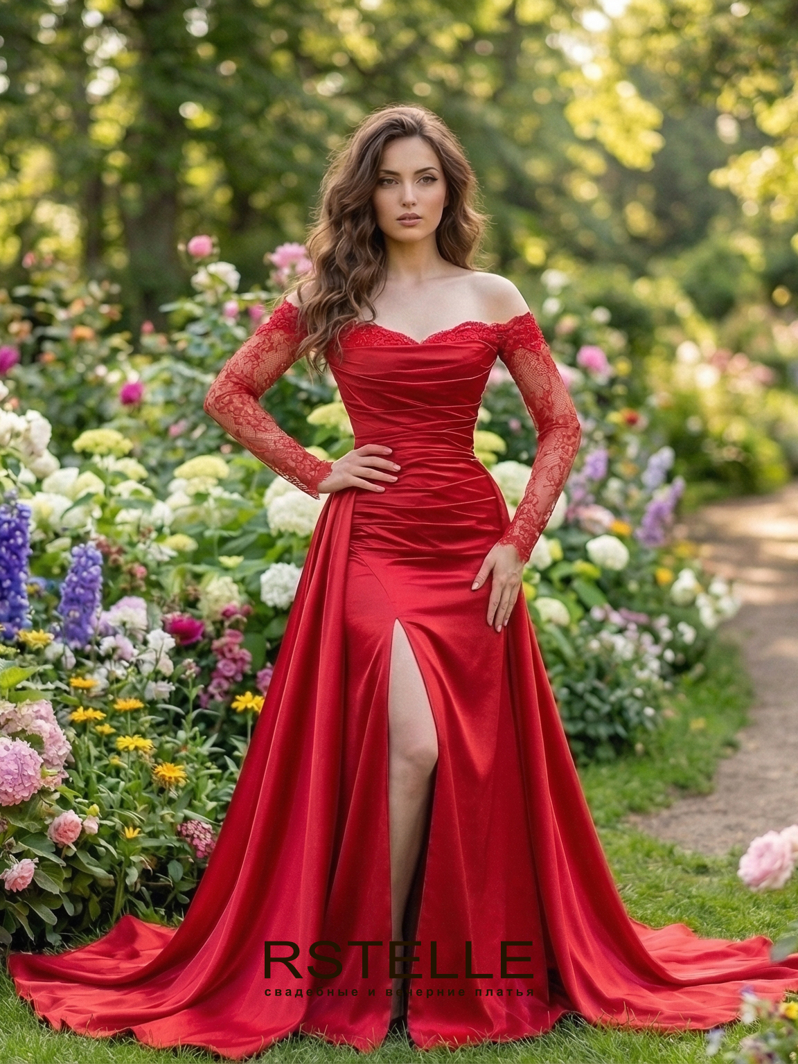 Элегантное красное вечернее платье из матированного атласа. Нежные спущенные кружевные рукава придают очарования, двойная юбка делает силуэт универсальным, а разрез на основной юбке удлиняет ножки. Косой крой на лифе и юбке, превосходно подчеркивает фигуру, маскируя нюансы. Идеальное платье для вашего торжества. Возможны разные цвета.