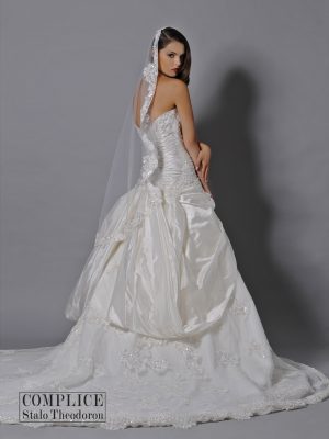 Complice Stalo TheodorouЭксклюзивное свадебное платье А-силуэта из натурального шелка ручной работы от кипрского дизайнера Stalo Theodorou. Открытый верх и расшитое кружево, пышная юбка со съемной баской и длинным шлейфом, сделают ваш образ неотразимым. Королевское платье для королевской свадьбы!