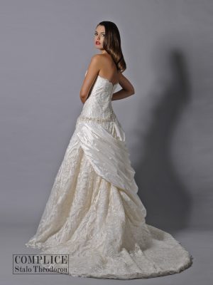 Complice Stalo TheodorouЭксклюзивное свадебное платье А-силуэта из натурального шелка от кипрского дизайнера Stalo Theodorou. Платье вручную расшито кристаллами Swarovski, V образный вырез подчеркивает грудь, съемная баска на юбке позволяет менять образ, длинный роскошный шлейф, делает платье королевским.