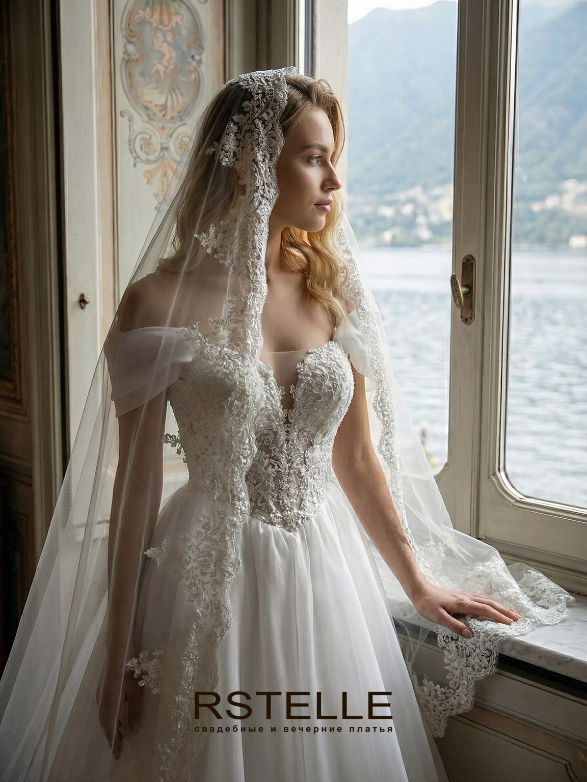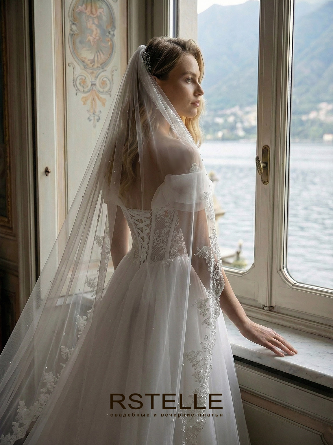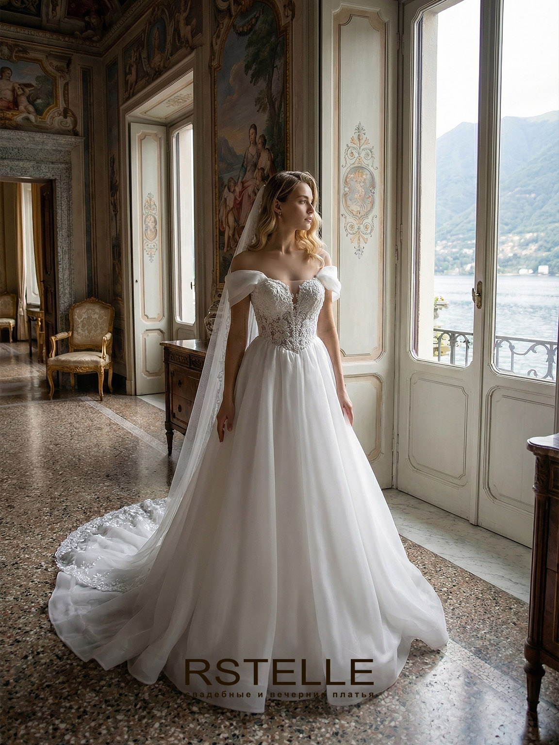 Свадебное платье из органзы с расшитым кружевным корсетом. V-образный вырез превосходно подчеркивает грудь, а клиновидный корсет сердечком, выделяет талию. Легкие спущенные бретели, прикрывают линию плеч. Юбка правильной А-силуэтной формы из матовой органзы делает образ торжественным.