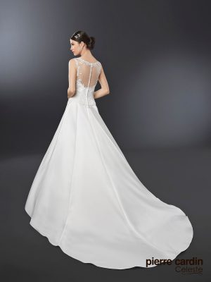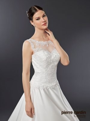 Pierre CardinЛегкое и нежное атласное свадебное платье от знаменитого бренда Pierre Cardin, А-силуэтное с заниженной талией, подчеркивающей силуэт, закрытый верх лодочкой из расшитого кружева и открытой спинкой, юбка из жемчужного атласа, длинный шлейф дополнит ваш королевский образ.
