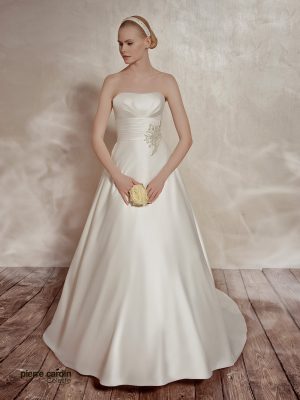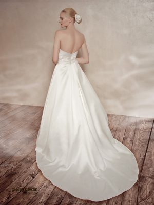 Стильное свадебное платье из нежнейшего атласа А-силуэта от самого известного дизайнера Pierre Cardin. Съемный верх делает платье закрытым и придает женственность, прямой корсет увеличивает грудь, пояс подчеркивает талию, длинный шлейф придает торжественность. Съемные бретели.