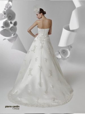 Pierre CardinСтильное и элегантное кружевное свадебное платье А-силуэта от самого известного дизайнера Pierre Cardin. Открытый корсет и лента под грудью увеличивают грудь, нежнейшее французское кружево и длинный шлейф придают платью элегантность. Идеально для будущей мамы. Брошь съемная.