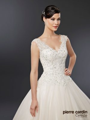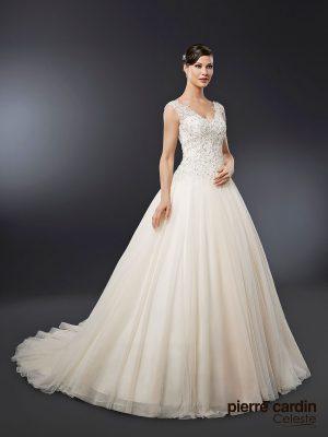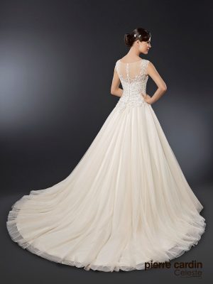 Pierre CardinНежное кружевное расшитое свадебное платье от знаменитого бренда Pierre Cardin, а-силуэт, с закрытым верхом и элегантной кружевной спинкой, легкий персиковый оттенок придает платью воздушности, а роскошный, длинный шлейф торжественности. Эксклюзивно в RSTELLE.