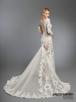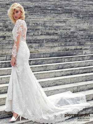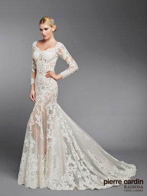 Pierre CardinЭксклюзивное кружевное свадебное платье от знаменитого бренда Pierre Cardin, силуэт русалка(рыбка) закрытое с рукавами, полностью из нежного расшитого кружева. Свадебное платье трансформер. Длинный королевский шлейф. Эксклюзивно в RSTELLE.