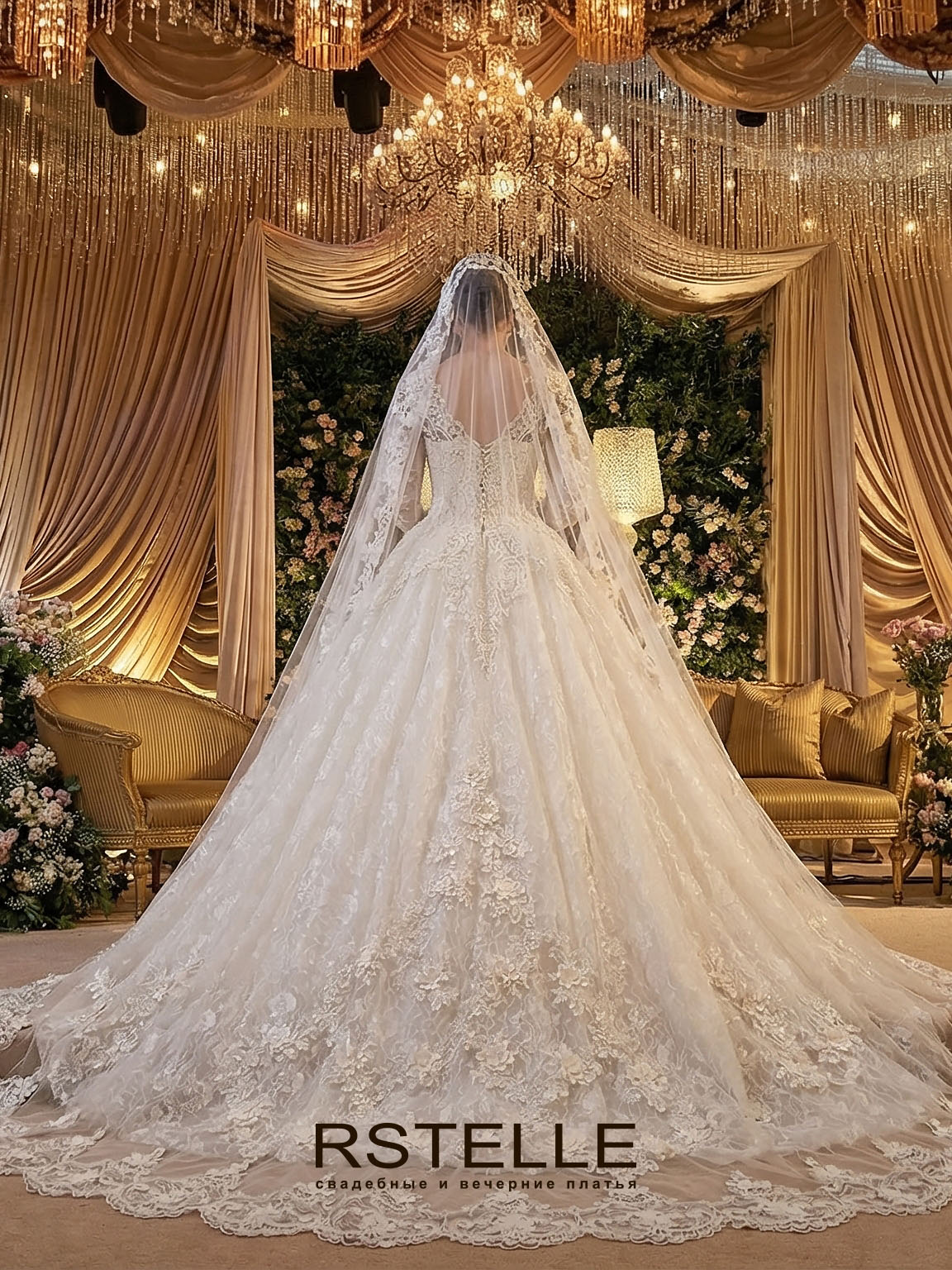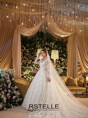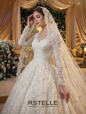 Пышное кружевное свадебное платье из расшитого, мерцающего кружева. Длинные нежные рукава, V-образный вырез на груди и спинке. Плотный корсет превосходно подчеркивающий талию. Королевское платье.