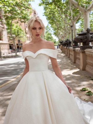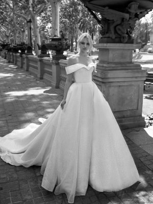 Dovita BridalВосхитительное пышное мерцающее свадебное платье с блеском, а-силуэта, с нежными спущенными плечами, прикрывающими ручку,и длинным королевским шлейфом. Звездное платье для звездных невест. В наличии.