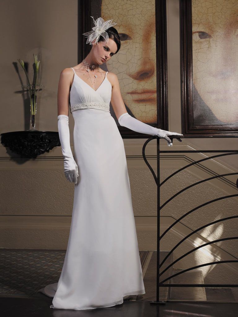PronuptiaЭлегантное прямое шифоновое свадебное платье на бретелях с поясом под грудью и дополнительным пристегивающимся шлейфом. Франция.