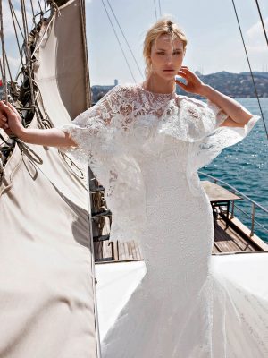 Dovita BridalУльтрамодное расшитое, кружевное свадебное платье силуэта русалка(рыбка) сочетающая в себе несколько видов нежного кружева, с элегантным кейпом(накидкой). Закрытое свадебное платье трансформер с длинным, королевским шлейфом. Только для стильных невест.
