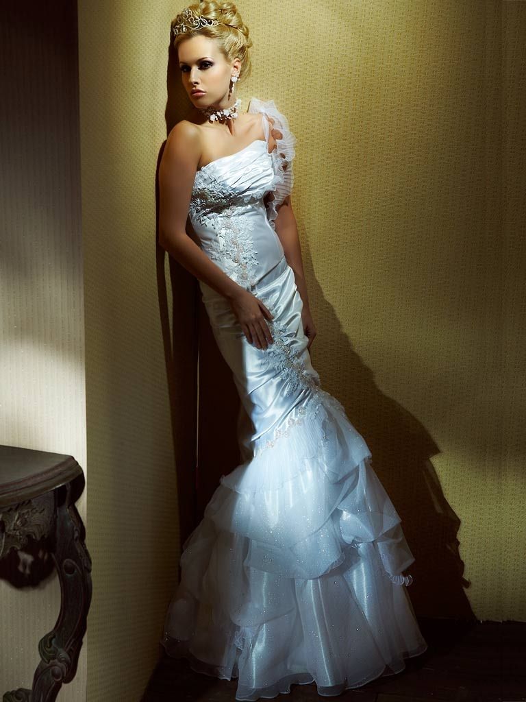 Стильное атласное свадебное платье с открытым верхом силуэта русалка с отделкой расшитым кружевом, идеально подчеркивает достоинства фигуры.