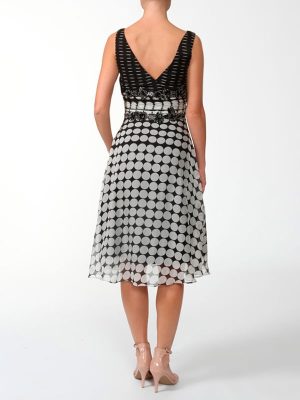 Прямое короткое вечернее платье средней длинны, ниже колена из натурального шелка расшитое черным кружевом, платье с V образным вырезом, подчеркивающим грудь. Цвета белый/айвори с черной отделкой.