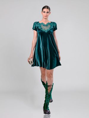 FaustЛегкое и стильное французское бархатное короткое вечернее платье от бренда Faust. Закрытый верх, отделка кружевом с маленьким рукавом. Платье свободного кроя превосходно садиться по фигуре. Представлено в зеленом(изумрудном) цвете.