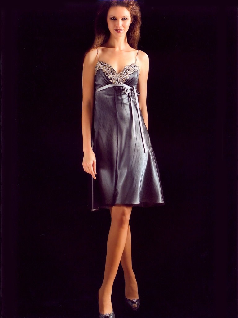 Короткое вечернее платье стального цвета с поясом под грудью из атласа, на бретелях и с кружевом. Фатин на атласном чехле.