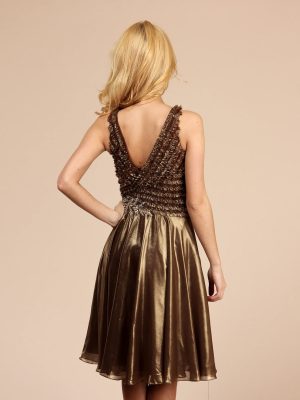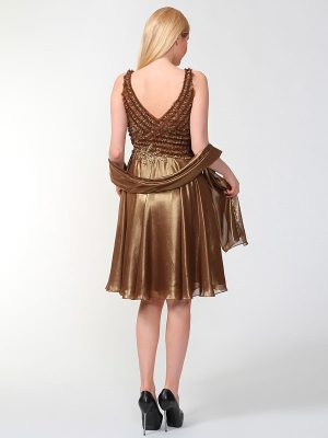 Короткое шифоновое вечернее платье с широкими бретелями, V образным вырезом и расшитым кружевом. Представлено в стальном или сером цвете.