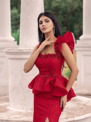 Стильное красное вечернее платье из кружева с баской. Силуэт рыбка(русалка) с разрезом на юбке и шлейфом. Превосходно подчеркивает талию и скрывает то, что надо скрыть. Экстравагантное платье на свадьбу или день рождения.