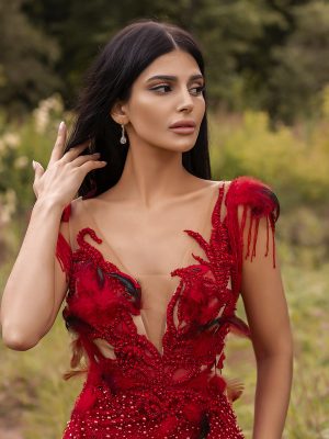 Эксклюзивное красное пышное вечернее платье силуэта рыбка(русалка) с потрясающими воланами. Легкий и воздушный верх с нежными перышками. Мерцающая, блестящая юбка. Эксклюзивное платье на свадьбу или день рождения.