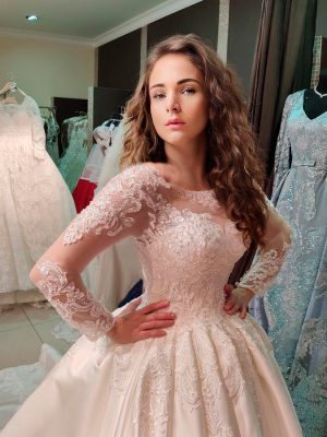 Алтасное пышное свадебное платье с длинными рукавами. Платье декорированно расшитым кружевом и кристаллами. Нежный закрытый верх и вырез лодочкой. Длинный королевский шлейф придаст торжественности.
