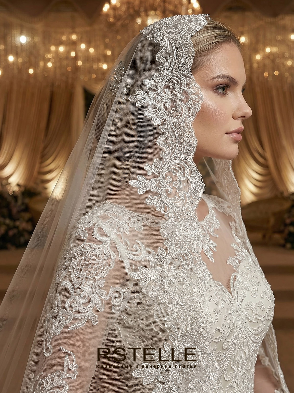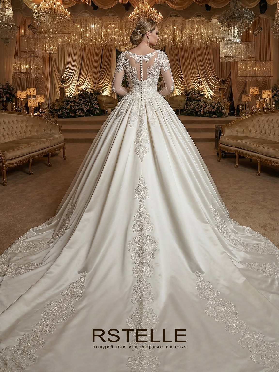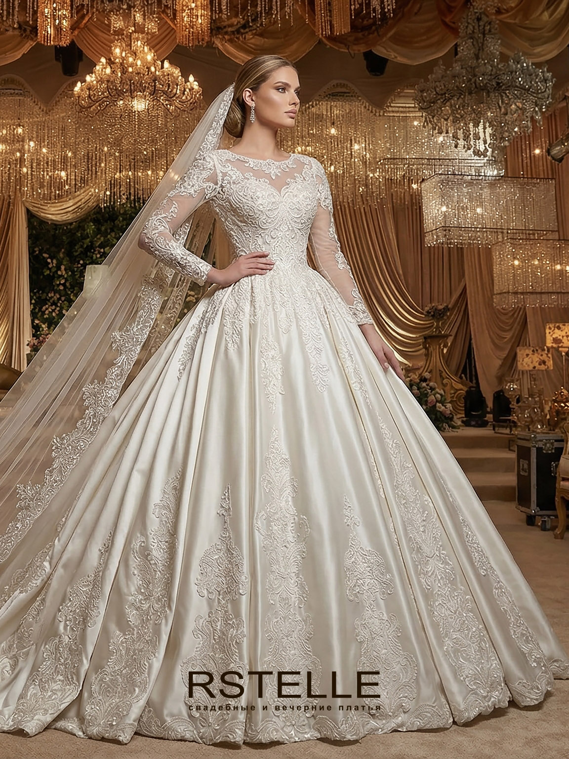 Атласное пышное свадебное платье с длинными рукавами. Платье с нежным расшитым кружевом и кристаллами. Легкий закрытый верх и вырез лодочкой. Длинный королевский шлейф придаст торжественности. Атласное платье с кружевом на юбке.