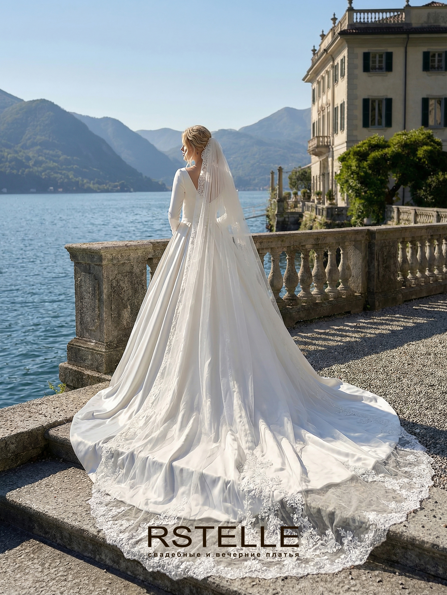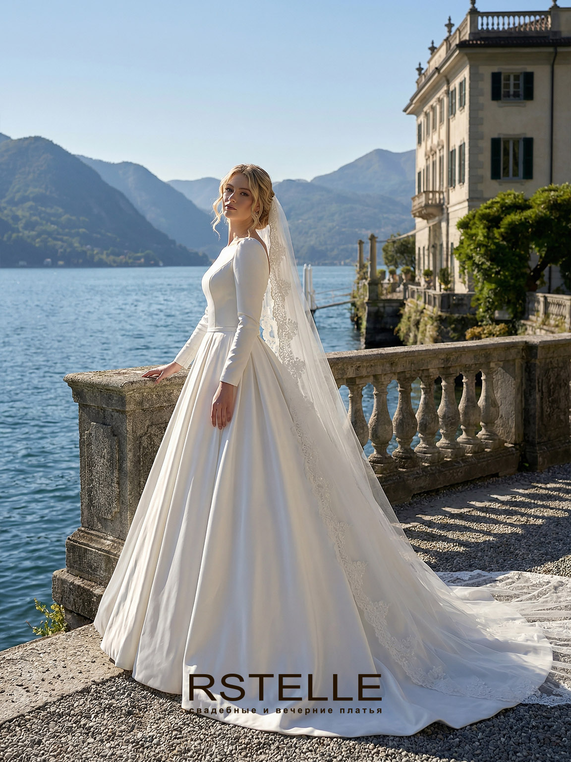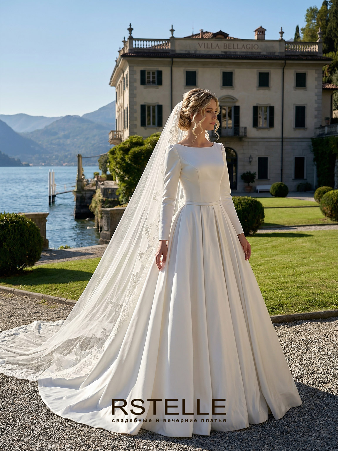 Атласное свадебное платье с рукавами. Нежный и благородный матовый атлас. Вырез лодочкой придает нежности, тонкий пояс выделяет талию. Роскошная А-силуэтная юбка с длинным и легким шлейфом дополнит ваш стильный образ.