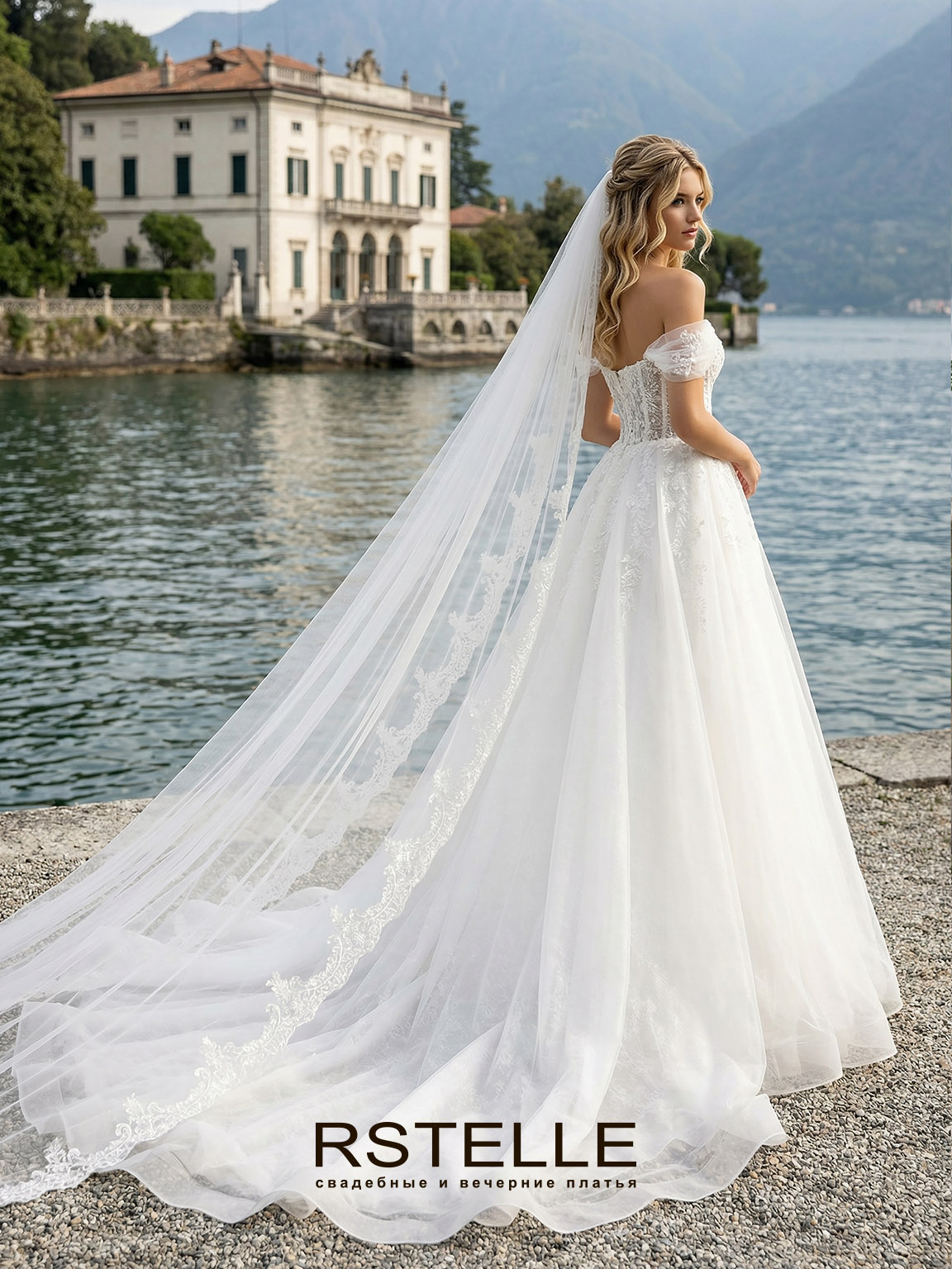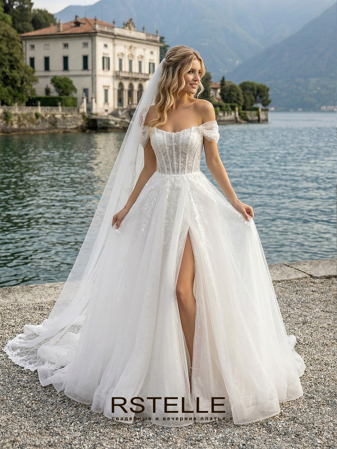 Кружевное свадебное платье с разрезом на юбке и с легкими спущенными бретелями. Бельевой корсет подчеркивает талию и грудь. Воздушная А-силуэтная юбка с расшитым кружевом. Элегантное и нежное свадебное платье.