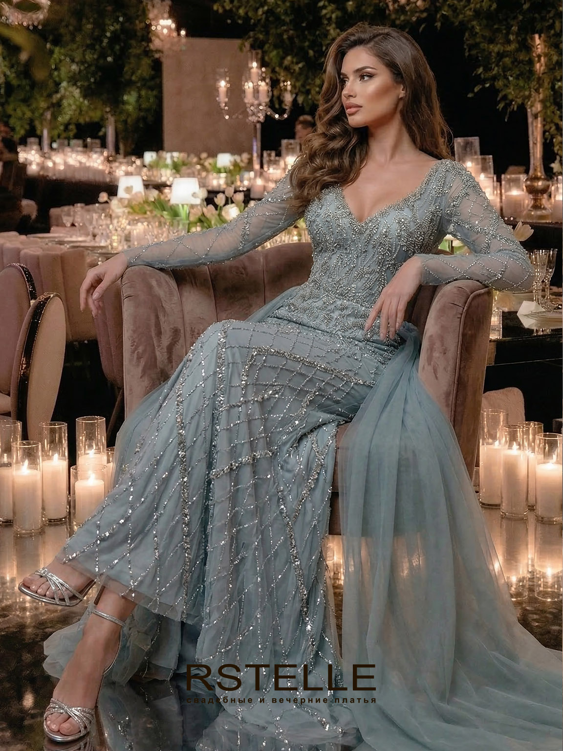 Эксклюзивное расшитое вечернее платье с рукавами. Прямой силуэт по фигуре, с разрезом на юбке превосходно вытягивает силуэт, а V-образный вырез подчеркивает грудь. Дополнительный съемный шлейф придает торжественности. Разрез на юбке может быть убран. Трендовый мятный цвет. Есть большие размеры.