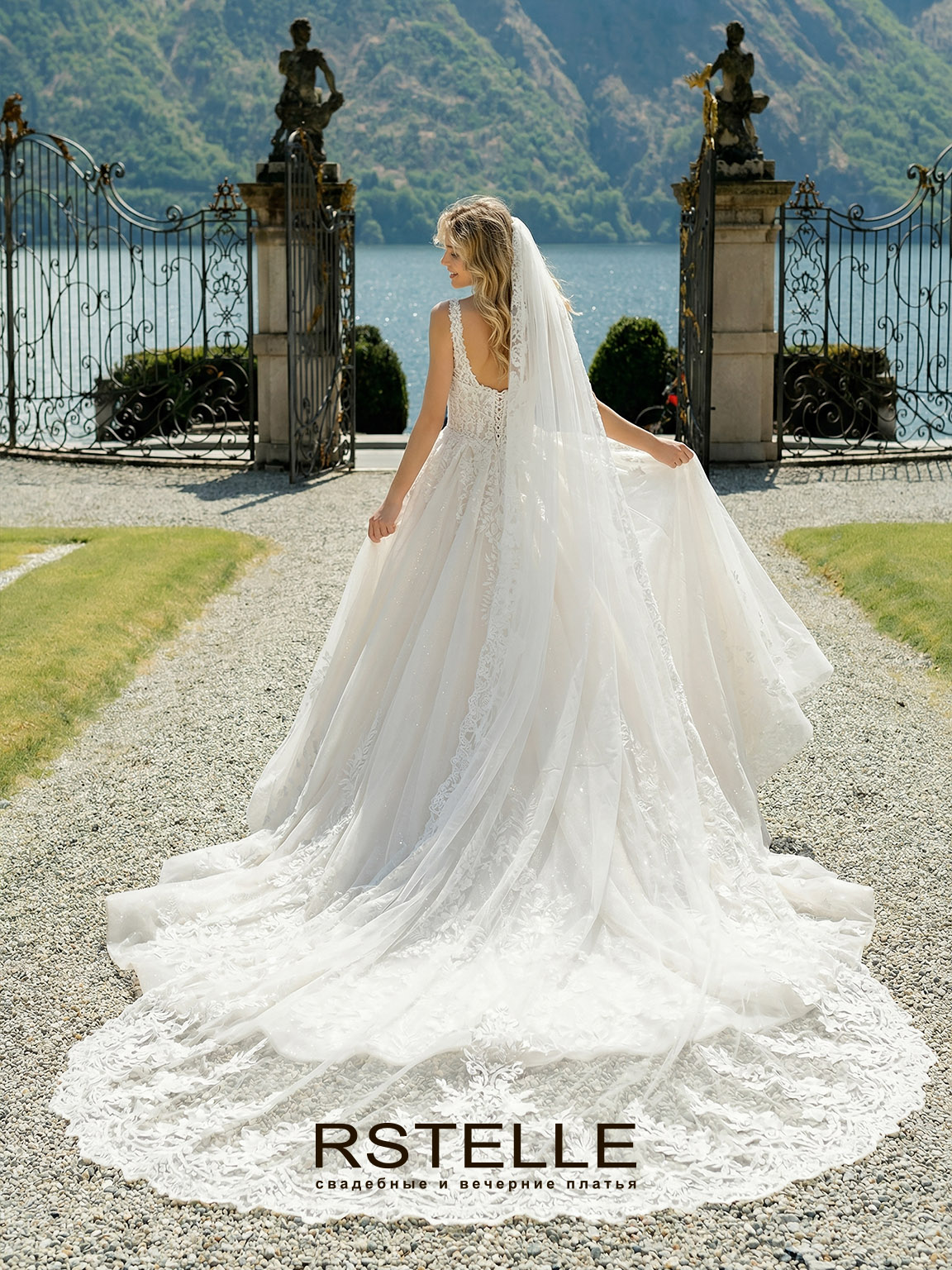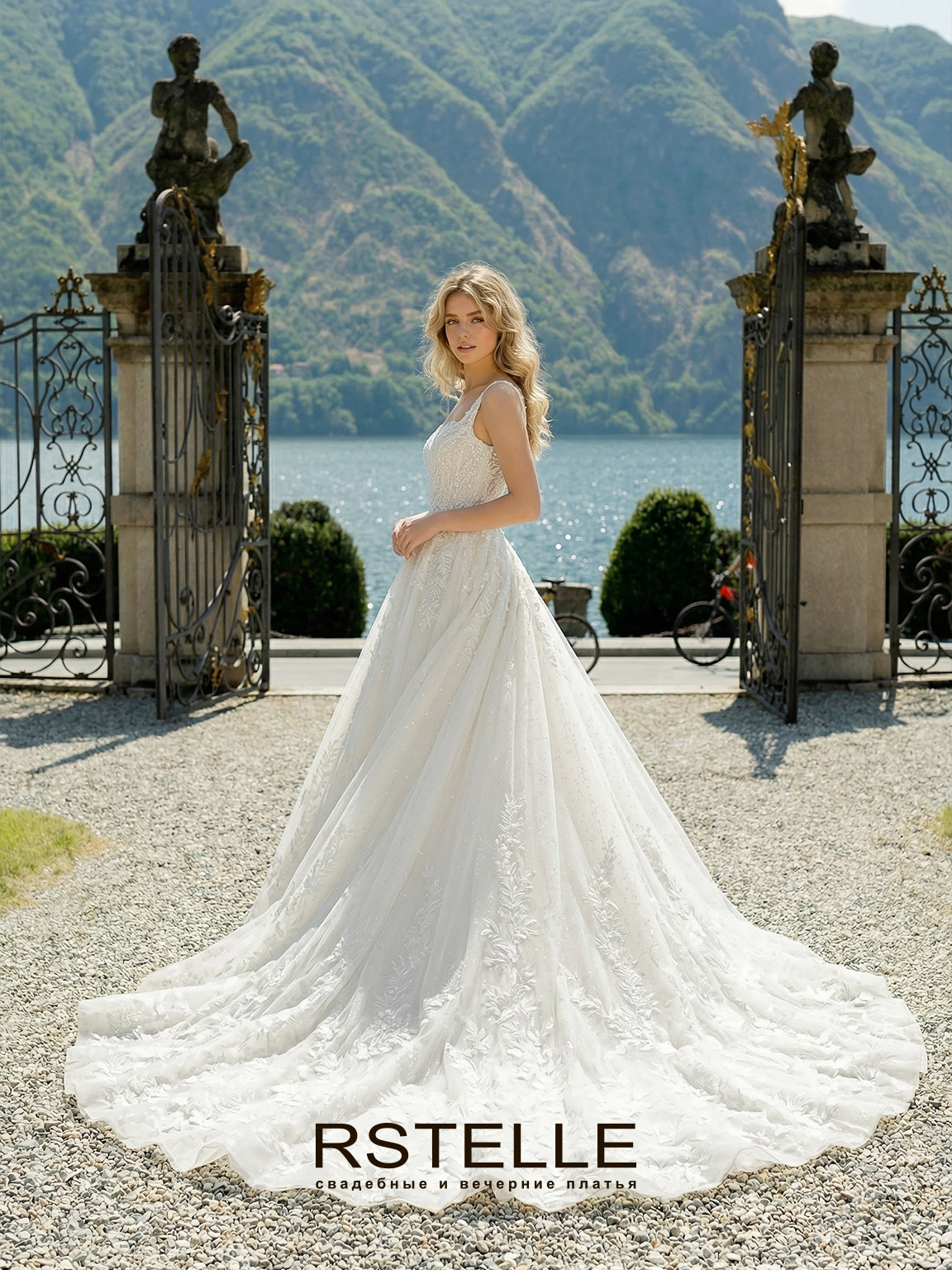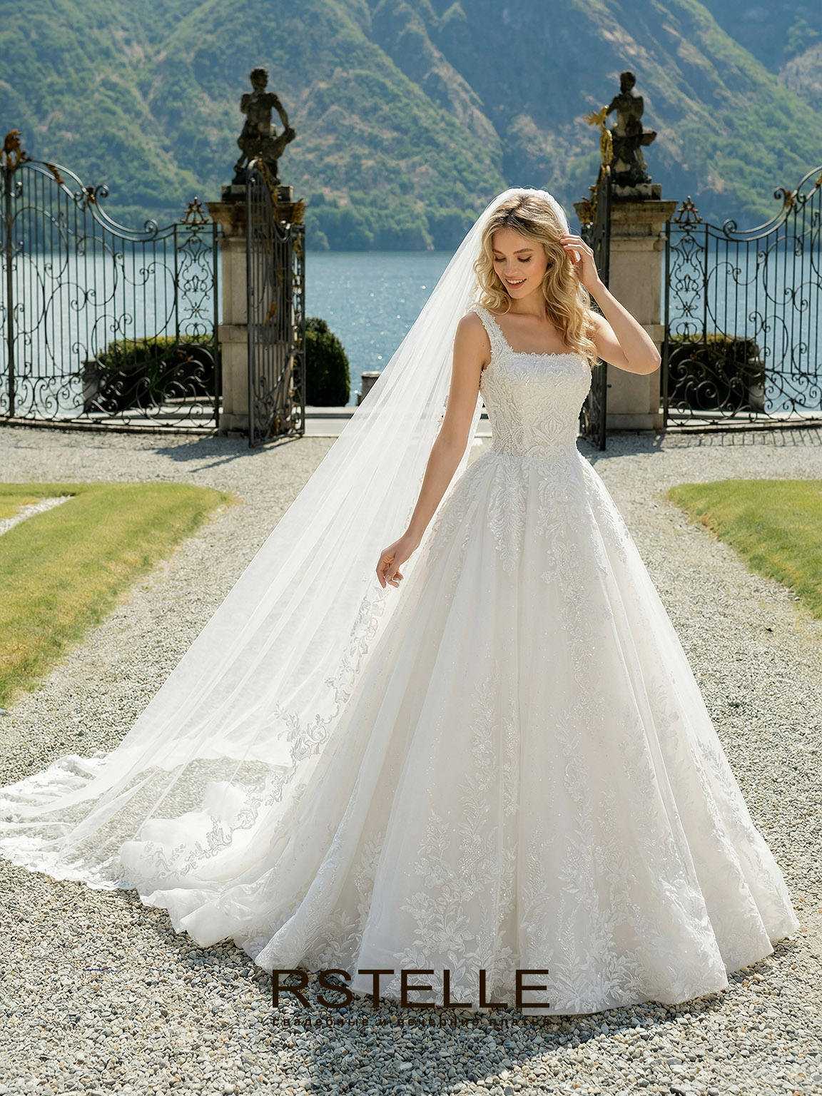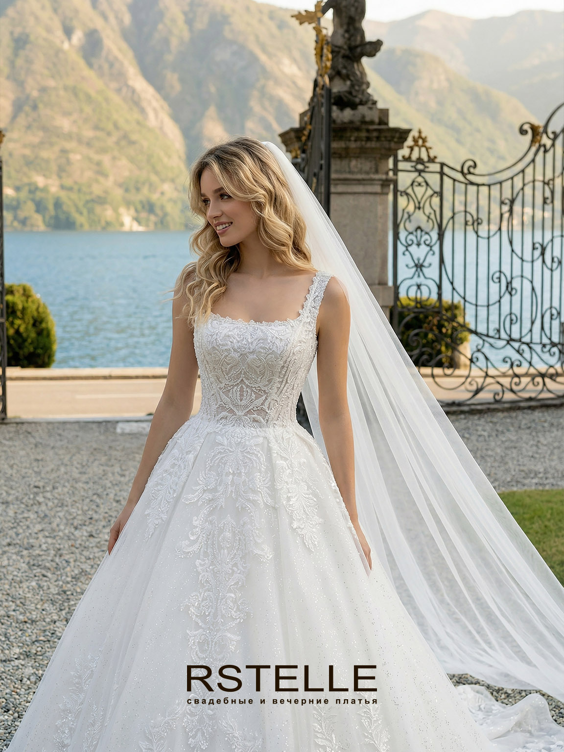 Пышное свадебное платье с расшитым кружевом и длинным шлейфом. Корсет с бретелями и квадратным вырезом, подчеркивает грудь. Красиво расшитое кружево с мерцающей основой делает образ сказочным. Длинный, королевский шлейф. Возможен рукав.