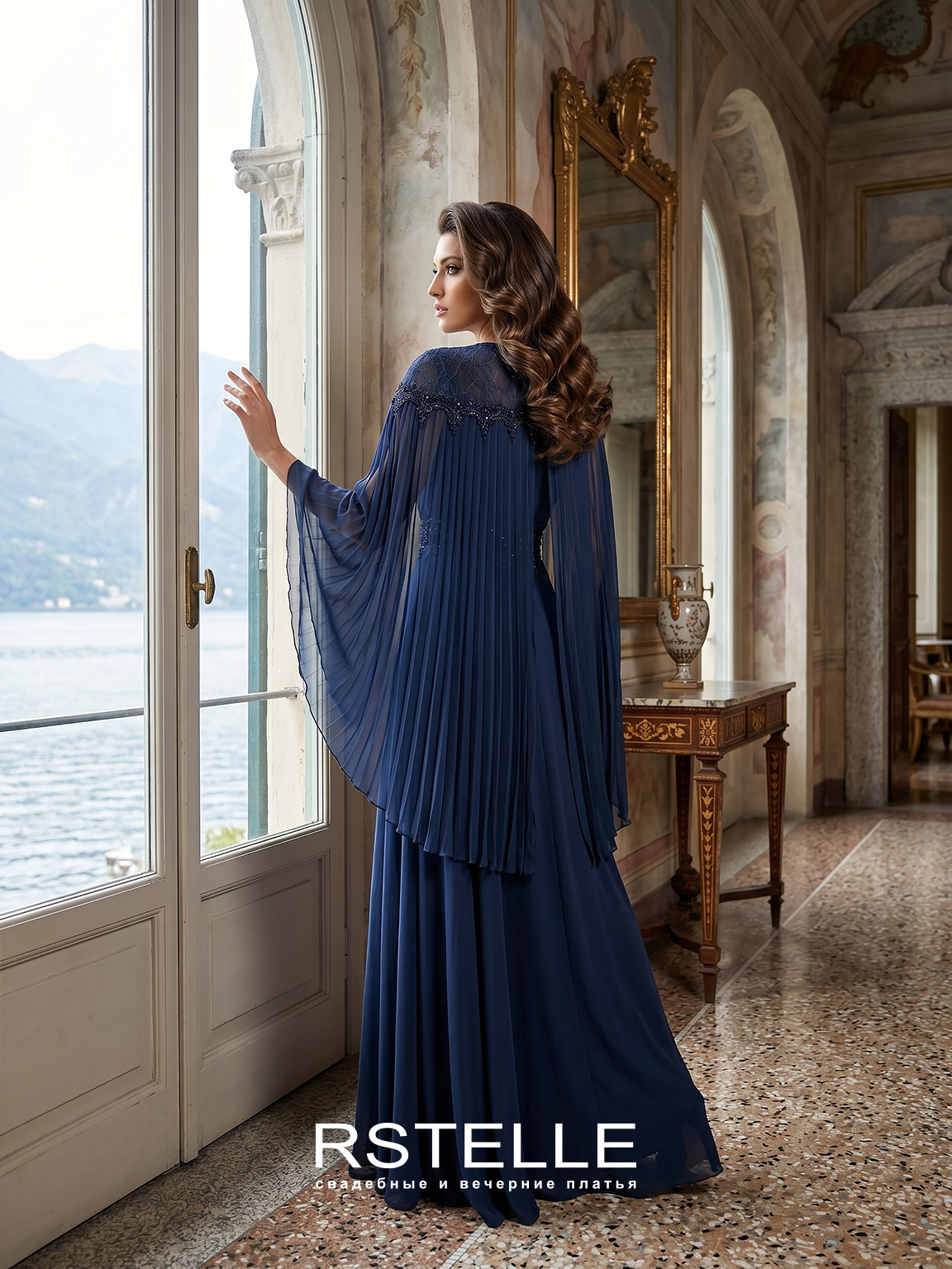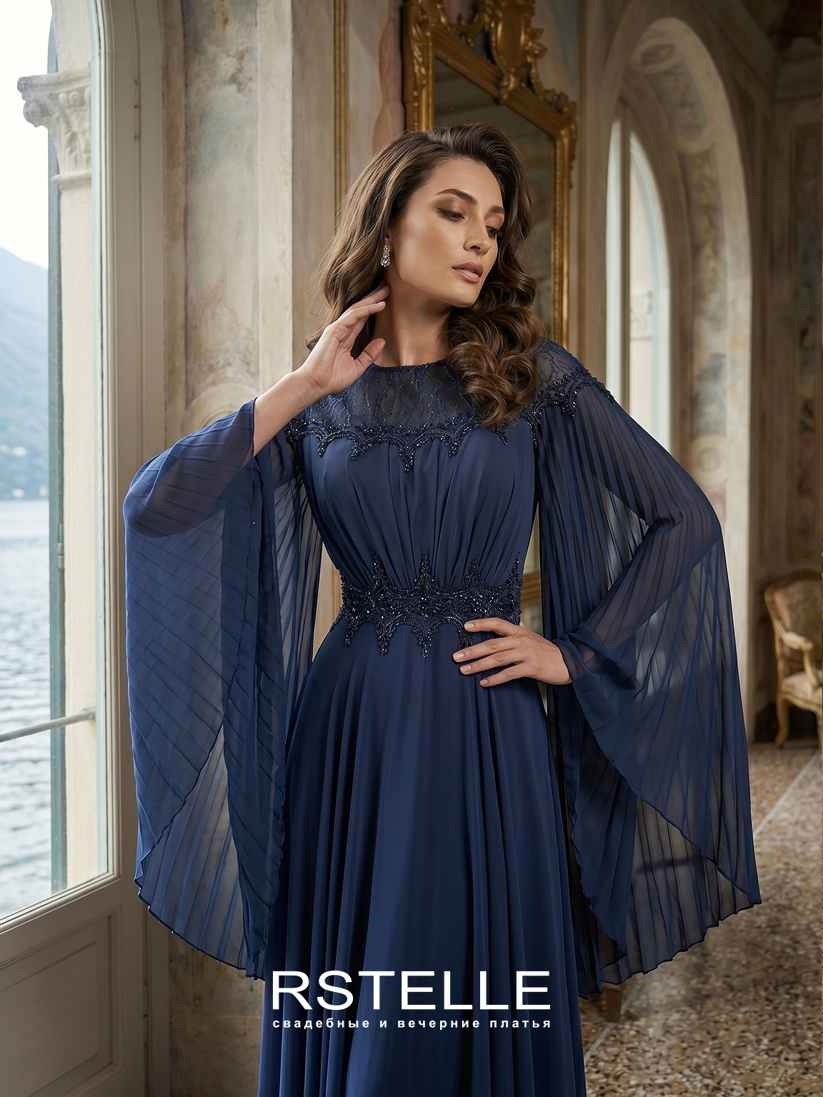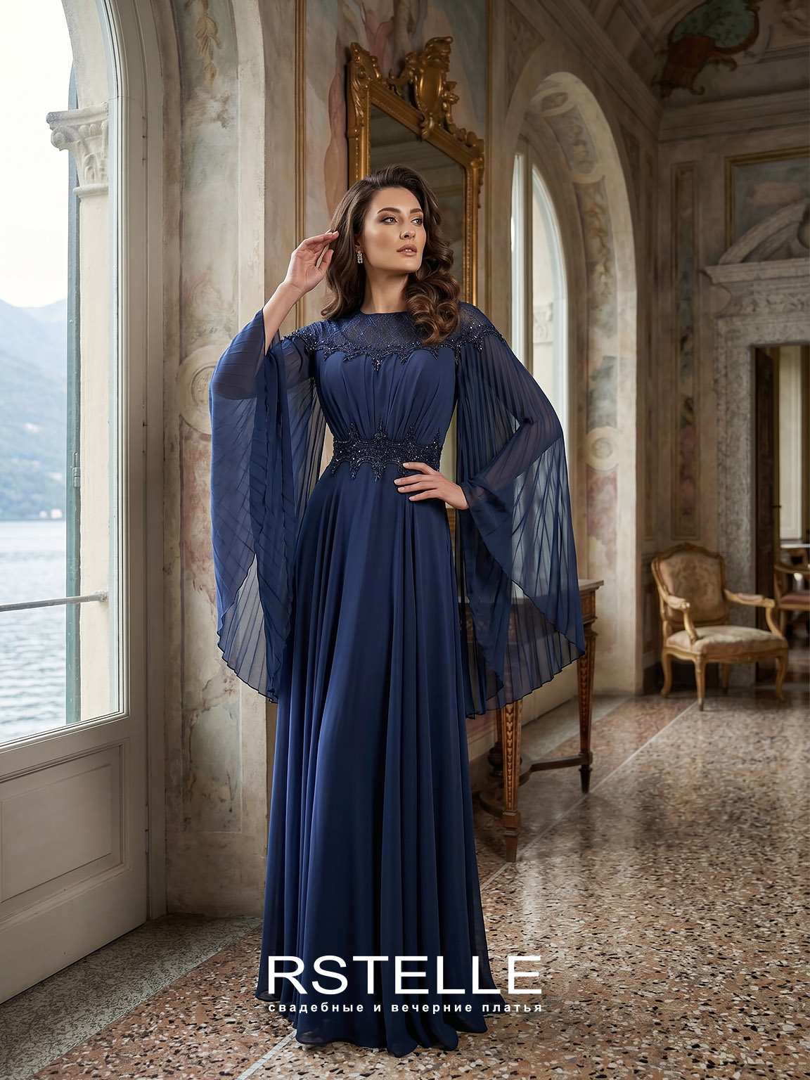 Шифоновое вечернее платье с гофрированным кейпом. Закрытое платье с нежным вырезом лодочкой. Кружево на талии превосходно подчеркивает силуэт, воздушная, летящая юбка придает нежности. Глубокий синий цвет. Идеальное платье для мамы на свадьбу.