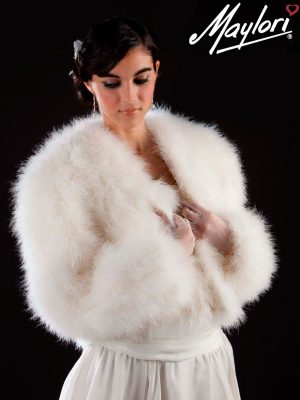 Стильная и теплая шубка с рукавами из пуха, идеально подойдет к любому свадебному платью. Благодаря небольшой длинне, она превосходно закрывает спинку от холода, но одновременно не закрывает ваше платье.