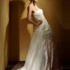 Элегантное свадебное платье из атласа с кружевом цвета айвори с заниженной талией, открытым верхом и длинным шлейфом.