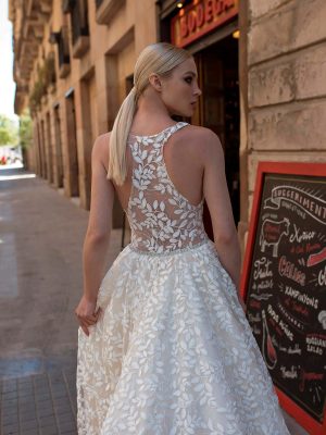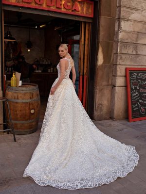 Роскошное кружевное свадебное платье с пышной и легкой юбкой и длинным королевским шлейфом. Талию выделяет тонкий расшитый пояс, V-образный вырез подчеркивает грудь. Легкое и нежное кружево.