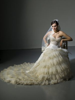 Complice Stalo TheodorouЭксклюзивное пышное свадебное платье А-силуэта от кипрского дизайнера Stalo Theodorou. Ручная работа, французское кружево расшитое кристаллами Swarovski, натуральная ткань, V образный вырез подчеркивающий грудь. Баска на юбке съемная. Пышная юбка и длинный кружевной шлейф.