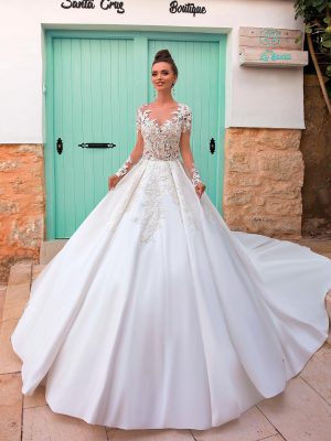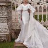 Роскошное расшитое кружевное свадебное платье А-силуэта из тафты микадо, с закрытым верхом и рукавами, королевская юбка с длинным и легким шлейфом. Для самых стильных невест.