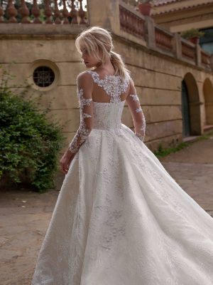 Эксклюзивное, королевское свадебное платье из нежного, расшитого кружева, с V-рбразным вырезом и закрытой спинкой, юбка воланами с длинным, роскошным, шлейфом. Платье настоящей принцессы.