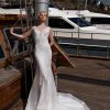 Потрясающее легкое и воздушное свадебное платье с расшитым, закрытым, верхом — лодочкой и спущенными плечами, тонкий и нежный пояс подчеркивает талию, летящая юбка с длинным шлейфом, придает торжественности.