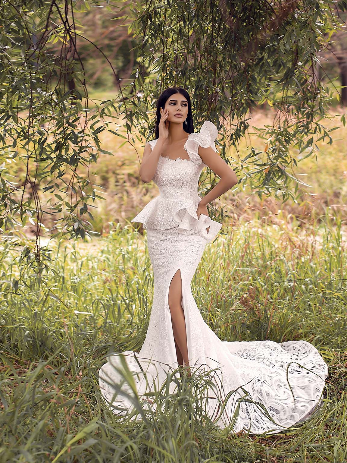 Стильное кружевное свадебное платье с баской, силуэта рыбка для невесты которая знает чего хочет. Из нежного расшитого кружева с разрезом на юбке и роскошным шлейфом. Асимметричные бретели отлично подчеркивают шейку и придают шарм.