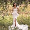 Элегантное кружевное свадебное платье с блеском из мерцающей ткани силуэта рыбка(русалка). Нежное, мягкое кружево, вставки из сетки по бокам корсета, отлично вытягивают силуэт и подчеркивают талию. Легкие перышки развиваются на ветру и придают легкости образу, а шлейф добавляет шарма и торжественности.