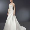 Pierre CardinЛегкое и нежное атласное свадебное платье от знаменитого бренда Pierre Cardin, А-силуэтное с заниженной талией, подчеркивающей силуэт, закрытый верх лодочкой из расшитого кружева и открытой спинкой, юбка из жемчужного атласа, длинный шлейф дополнит ваш королевский образ.