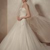 Элегантное свадебное платье из органзы А-силуэта от самого известного дизайнера Pierre Cardin. Расшитый прямой корсет увеличивает грудь, заниженная талия подчеркивает бедра и талию, съемный цветок делает юбку нежной, а шлейф прибавляет шарма.