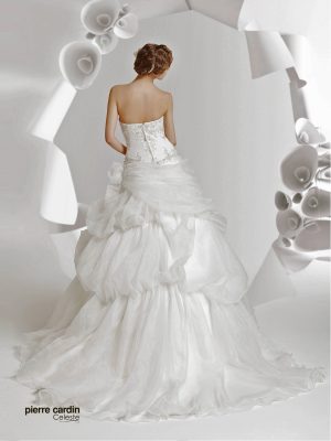 Эксклюзивное пышное свадебное платье А-силуэта от самого известного дизайнера Pierre Cardin. Кружевной расшитый корсет с вырезом подчеркивает грудь, пышная юбка с воланами и шлейфом придает роскошь и торжественность вашему образу. Платье может быть с завышенной талией.