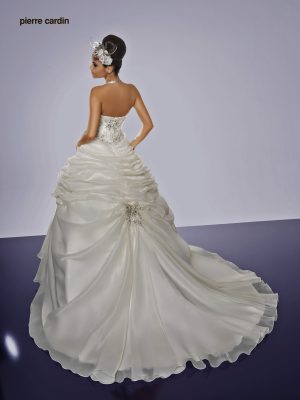 Эксклюзивное пышное расшитое свадебное платье А-силуэта от самого известного дизайнера Pierre Cardin. Прямой расшитый корсет подчеркивает грудь, сборка на юбке придает пышность, длинный шлейф делает платье королевским.