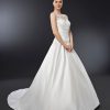 Pierre CardinНежное и стильное свадебное платье большого размера от знаменитого бренда Pierre Cardin, А-силуэтное с драпированным корсетом и заниженной талией, который идеально вытягивает силуэт, декольтированное, атласная юбка цвета айвори с жемчужным отливом и длинным шлейфом.