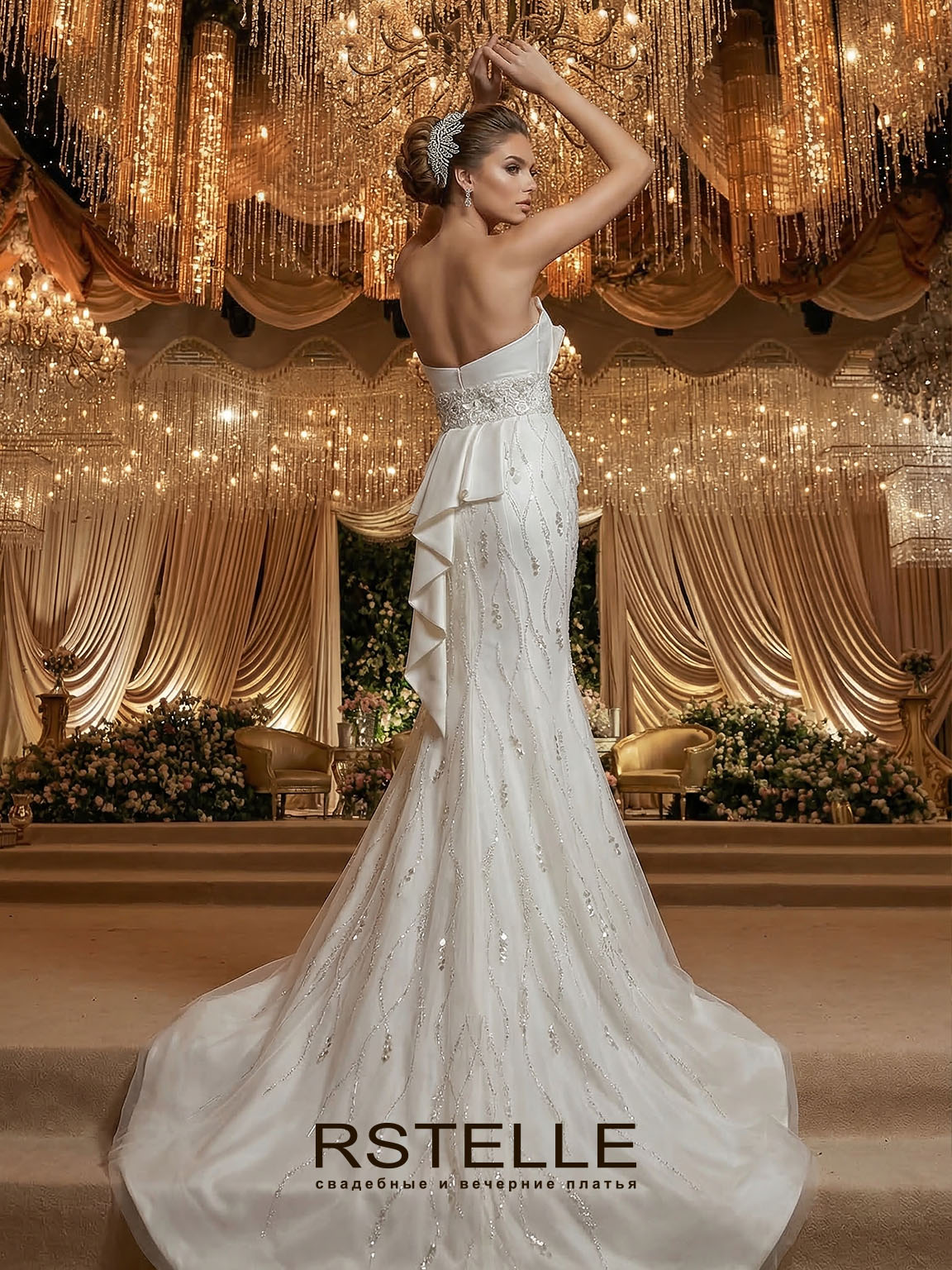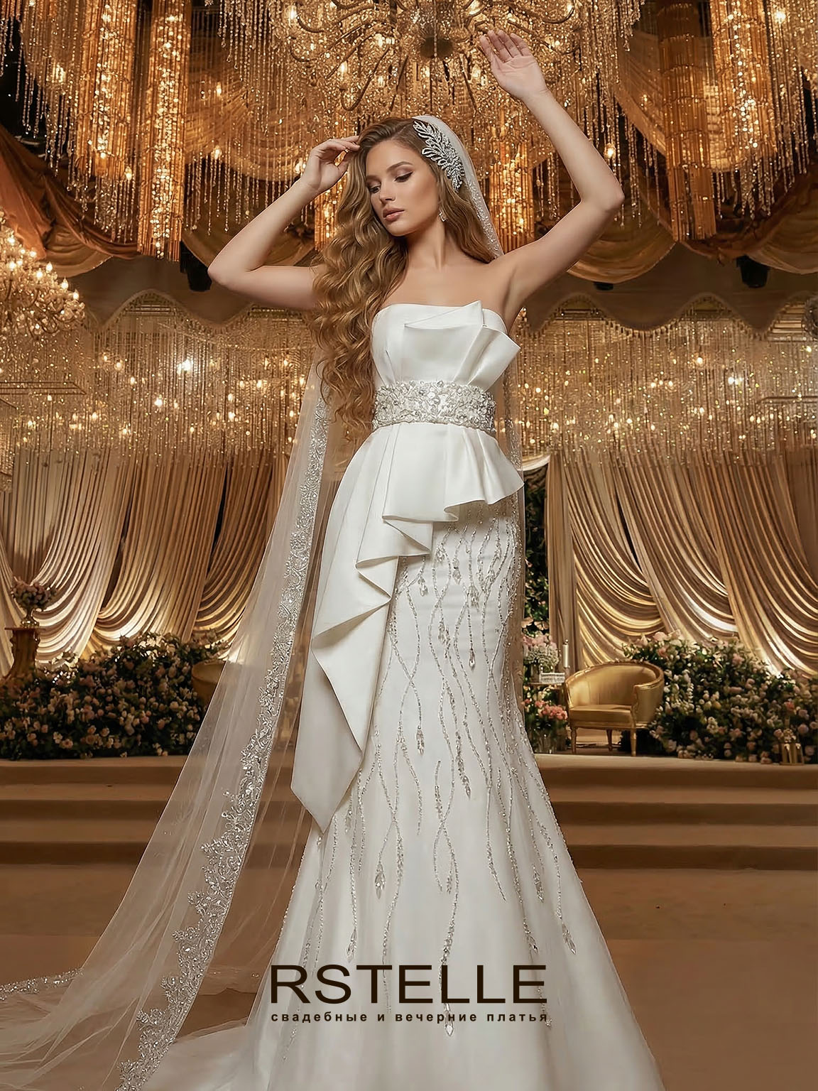 Pierre CardinЭксклюзивное расшитое свадебное платье силуэта русалка(fit’n’flare) от самого известного дизайнера Pierre Cardin. Прямой корсет с драпировкой увеличивает грудь, расшитый пояс подчеркивает талию горизонтально расшитая юбка и шлейф делают образ стильным и торжественным. Идеальная посадка.