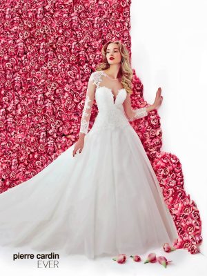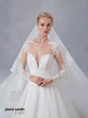 Pierre CardinЭксклюзивное пышное свадебное платье с рукавами, А-силуэта от самого знаменитого дизайнера Pierre Cardin. Нежный расшитый кружевной верх, великолепно подчеркивает талию и грудь, пышная юбка с длинным шлейфом делает образ королевским. Эксклюзивно для вас.