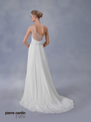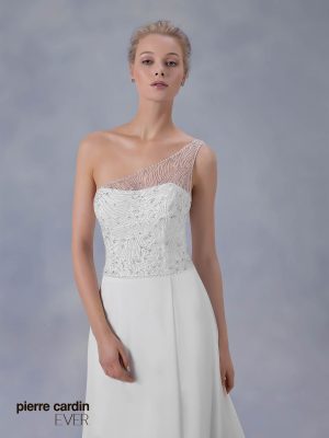 Pierre CardinЭксклюзивное нежное прямое шифоновое свадебное платье от самого знаменитого дизайнера Pierre Cardin. Вручную расшитое платье кристаллами Swarovski на одно плечо, великолепно подчеркивает талию, легкая летящая юбка с длинным шлейфом придает нежности и торжественности вашему образу.