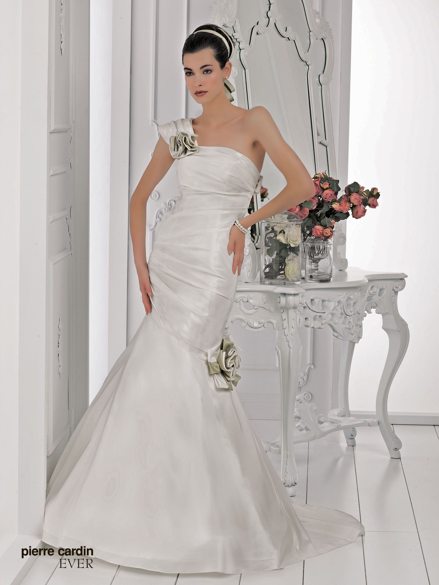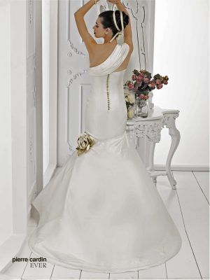 Pierre CardinЭлегантное и стильное свадебное платье силуэта русалка(рыбка) от самого известного дизайнера Pierre Cardin. Платье на одно плечо со съемной бретелей подчеркивает грудь, съемные цветы делают акценты, шлейф придает торжественности.