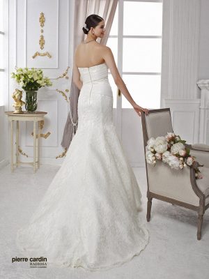 Эксклюзивное с нежным кружевом расшитое свадебное платье силуэта русалка от самого известного дизайнера Pierre Cardin. V-образный вырез на корсете подчеркивает грудь, съемный расшитый пояс делает талию еще тоньше, длинный шлейф придает королевскую торжественность.