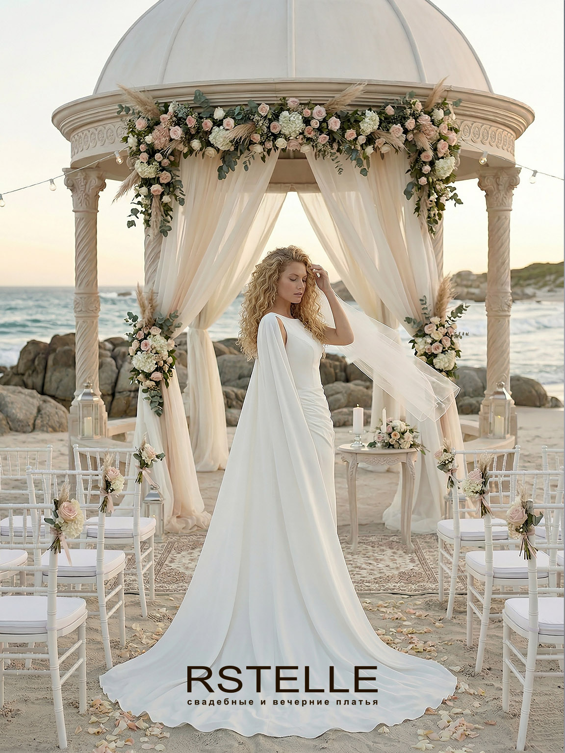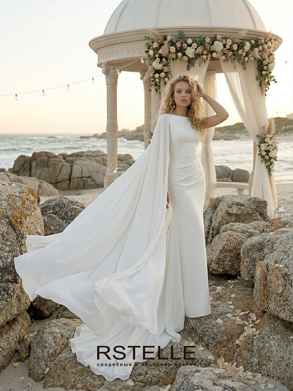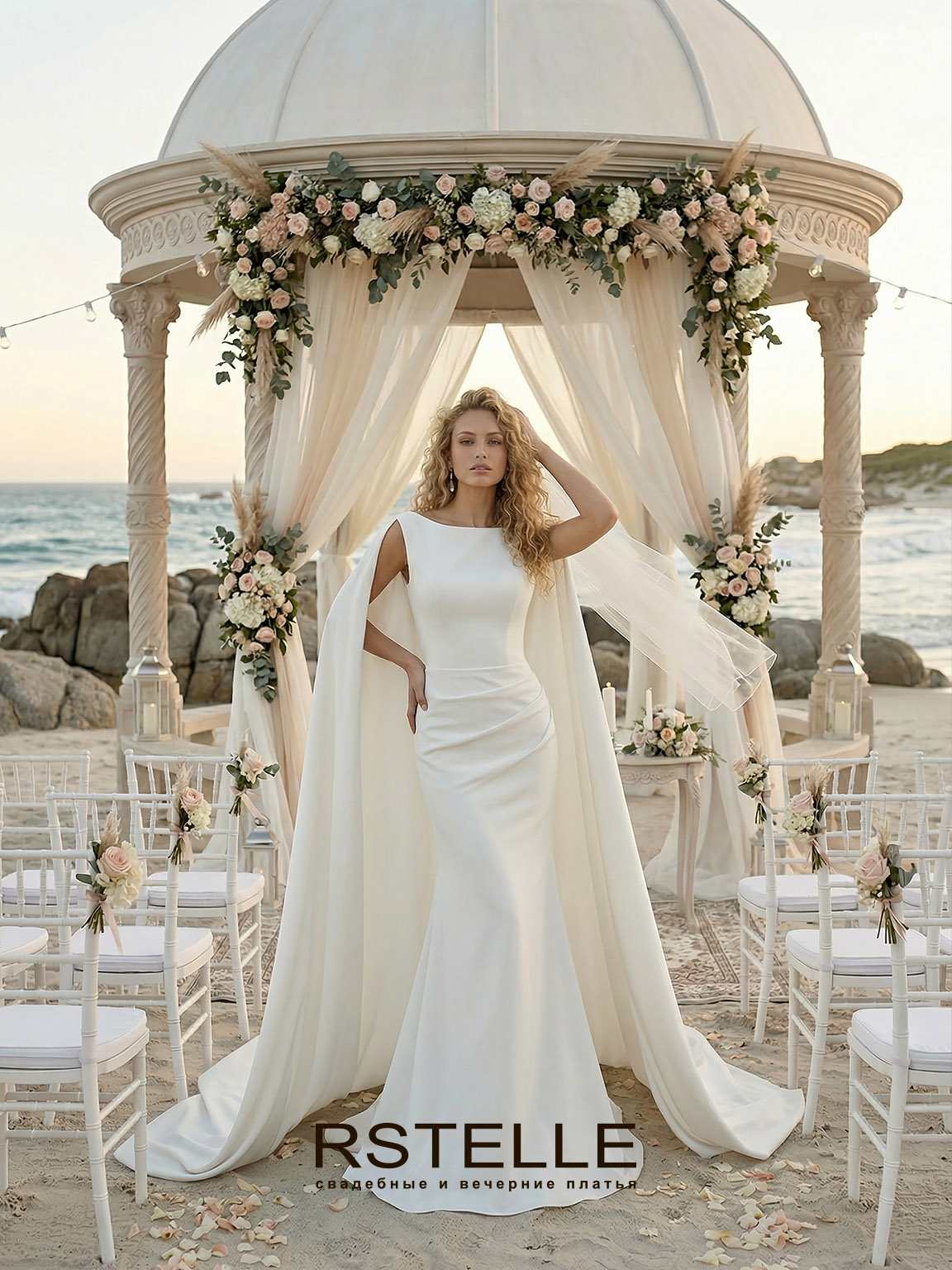 Свадебное платье русалка с кейпом(накидкой). Элегантный вырез лодочкой, закрытая спина, нежная драпировка на юбке подчеркивающая талию. Длинный съемный королевский шлейф. Платье возможно с дополнительным рукавом.