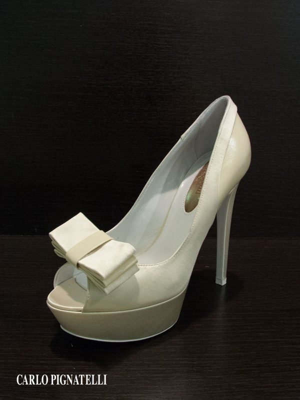 Итальянские свадебные туфли с бантом из мягкой кожи с высоким каблуком и платформой от самого знаменитого свадебного дизайнера Италии — Carlo Pignatelli. Невысокий подъем обеспечит вам комфорт на протяжении всей свадьбы. Представлены в цвете айвори.