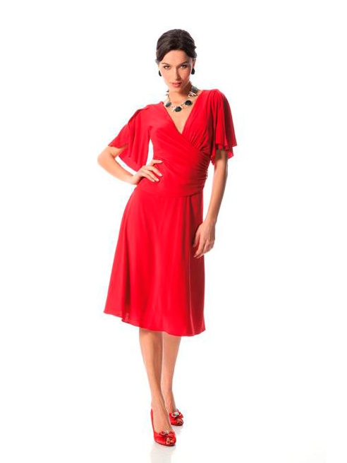 Короткое французское красное вечернее платье большого размера с рукавами и брошью на поясе, длинна ниже колена, миди, V образный вырез подчеркивающий грудь. Ткань стрейч.