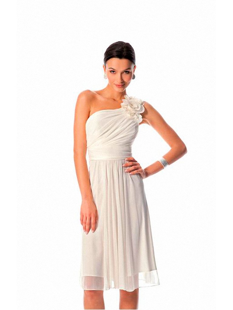 Короткое французское свадебное или вечернее легчайшее платье на одно плечо из газа. Цвет айвори. Цветок на бретели съемный.